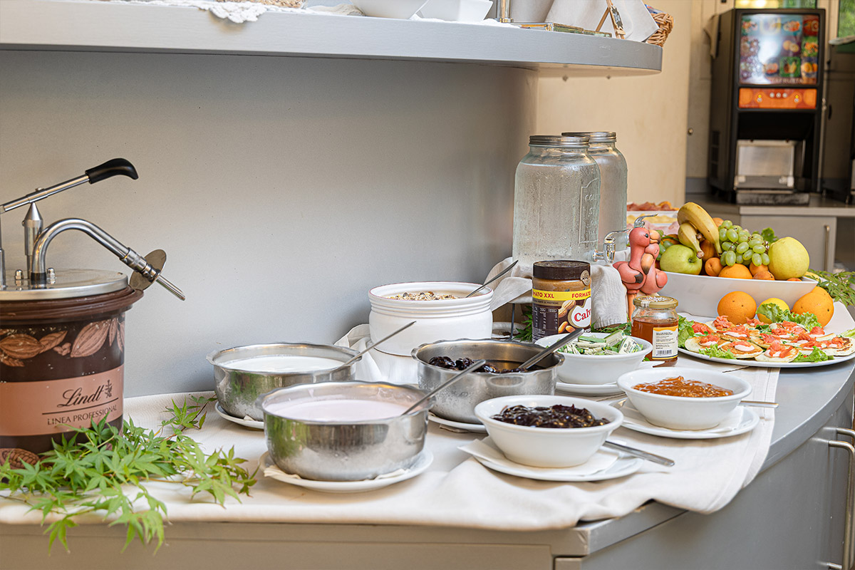 La mattina potrete godere di una generosa colazione a buffet: torte, crostate, ciambelle, biscotti e pasticceria sono di nostra produzione, con opzione gluten free. Si può scegliere anche fra cereali, yogurt al naturale e alla frutta, frutta fresca, latte fresco e di soia. La marmellata è sapientemente preparata dalla cucina. Caffè e cappuccini sono preparati al momento con la nostra Faema.